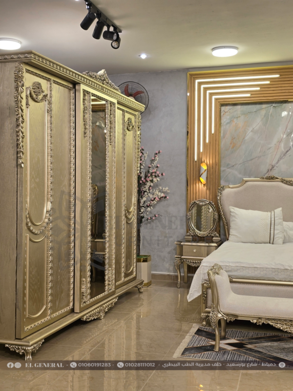 غرفة نوم كلاسيكيه رائعه باللون الشامبين مع الهاند ميد الرائع مصنوعة من أجود أنواع القماش المستورد مع الازاز الفاميه الفاخر الدولاب بمساحة تخزين واسعه مع اتنين كمود في منتهى الشياكه والعمليه والتسريحة بالشكل الفخم والسرير بالتنجيد العالي من خامات عاليه مع بانكت وشفنيرا عمليين وشكلهم حلو