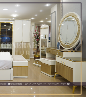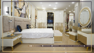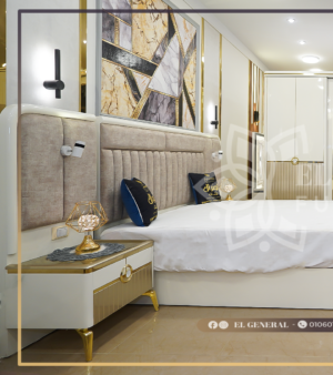 الوصف:غرفة نوم عصرية و فريدة بمكس بين اللون الأبيض و الجولد مع تداخل شرائح الاستالس والمقابض المستوردة والقماش الفخم لكي تناسب جميع الاذواق .