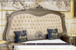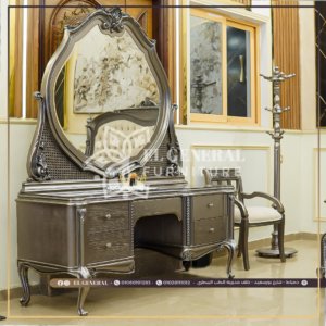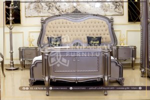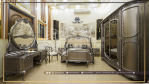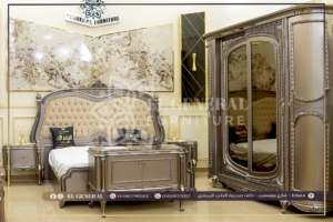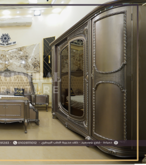 غرفة نوم نيوكلاسيك بلون جراي بنظام 4 درفة درفتين دريسنج ودرفتين مفصلي بتقسيمة مختلفة ومميزة جدا من الخارج والداخل مع وجود شكل دوران في حواف الدولاب وتداخل الخوص في أجزاء فنية حرفية وسط الأخشاب الزان الطبيعي تصميم ملكي فاخر بامتياز