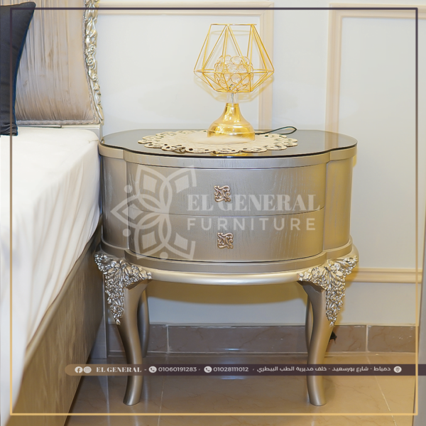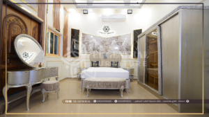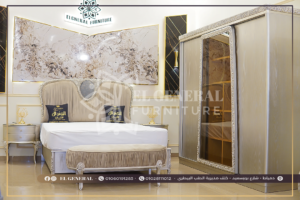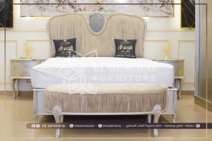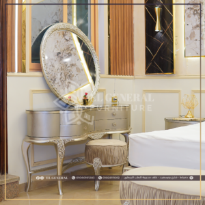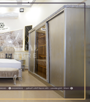 غرفة نوم نيوكلاسيك شامبين سيلڤر بنظام 3 درفة دريسنج ودرفتين برسم أويمة هاند ميد رقيق وسيمبل تصميم فخم جدا وكواليتي عالمي مع القماش البلاسيه في السرير والبانكت وكرسي التسريحة ونظام برواز الترا مودرن معلق