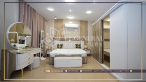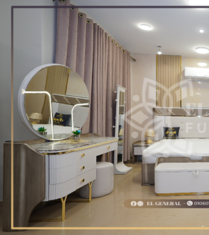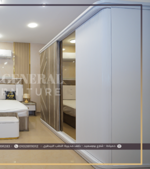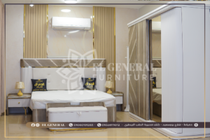 الوصف: غرفة نوم بتصميم راقي و جديد ميكس مابين اللون الخشبي و الأبيض مع تطعيمات الاستلس الساحرة ، غرفة عملية جداً لأن الدولاب بنظام جرار وبتقسيمة داخلية ممتازة مع الزجاج الفامية .