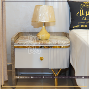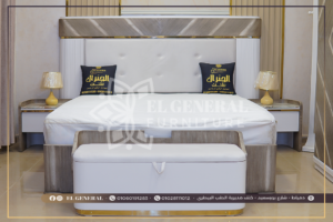 السرير تم تنجيده بطريقة بسيطة من المنتصف مع غرز كابتونية لتعطي للغرفة جمال خاص بجانب الأرجل والاكسسوار الاستالس المستورد