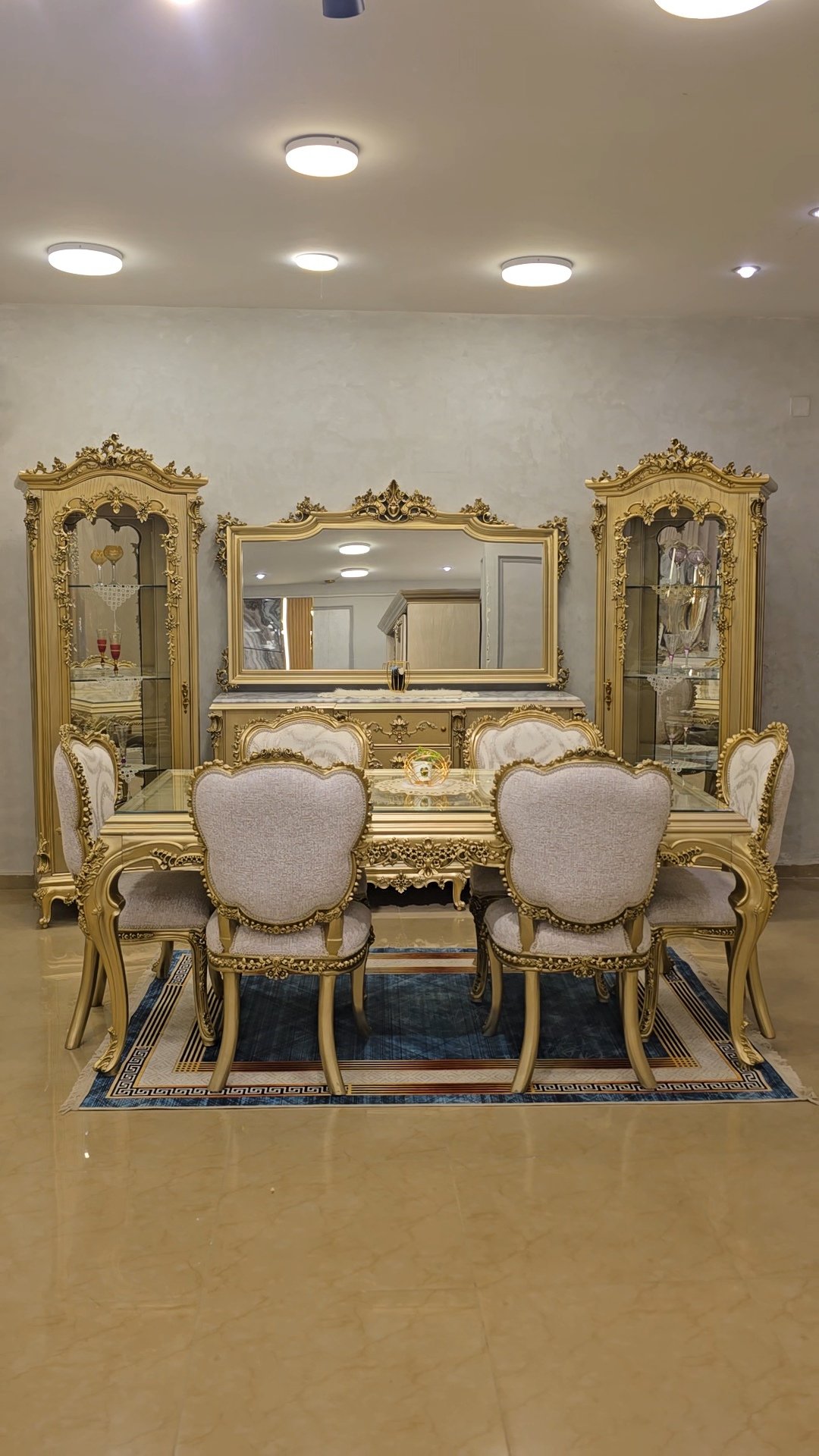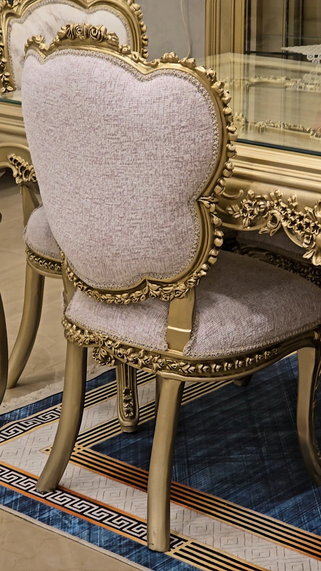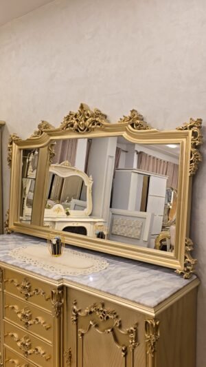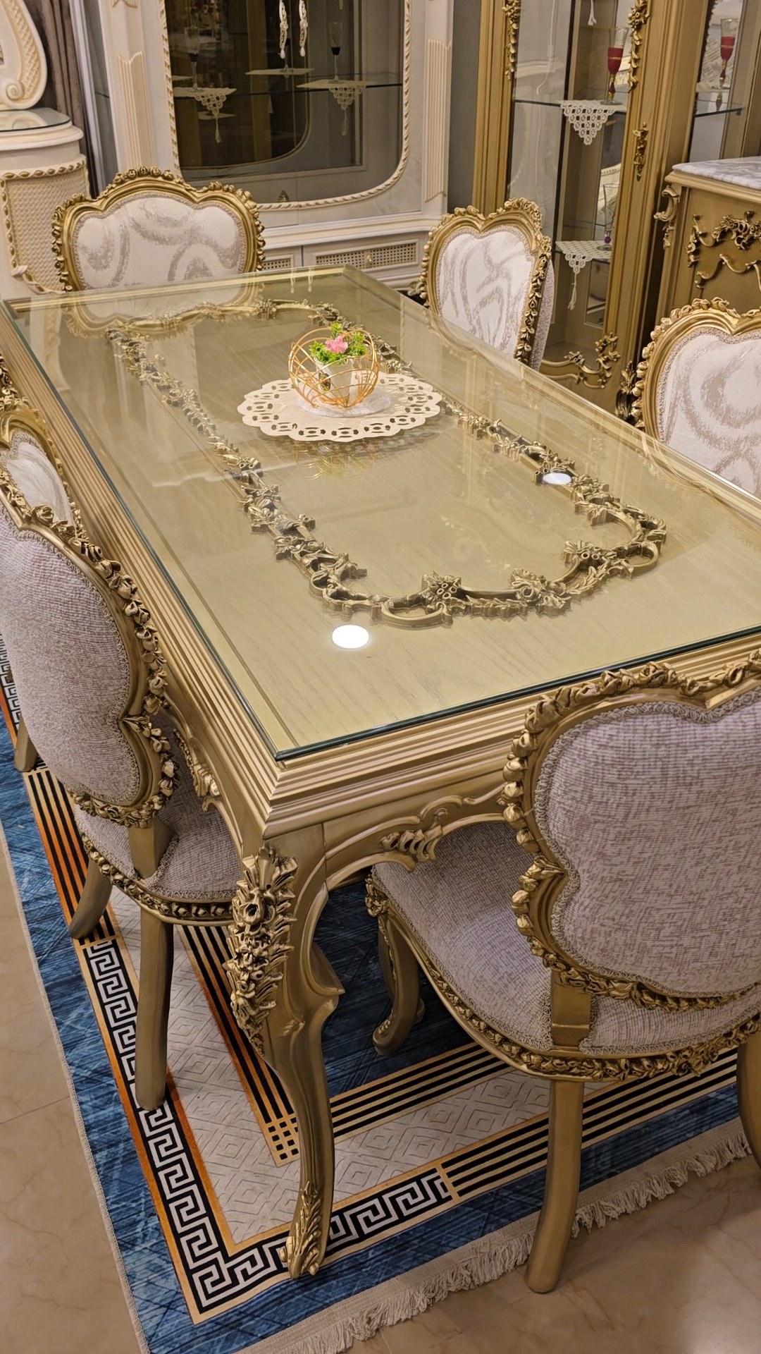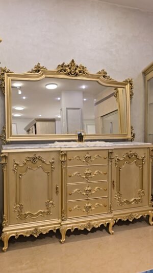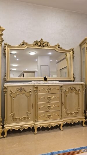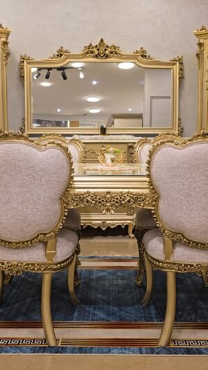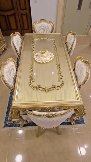 سفره بتصميم كلاسيكي عصري بخامات أخشاب عالي الجوده وبلون دهبي مميز وهاند ميد قوي ومبهر والأيمه بحرفيه عاليه وكثافة إسفنج وقماش راقي و إزاز بمتريال عالي وفاخر جدآ