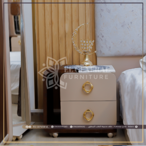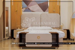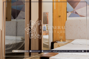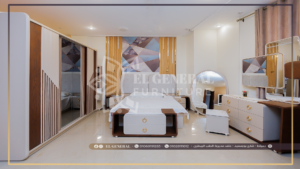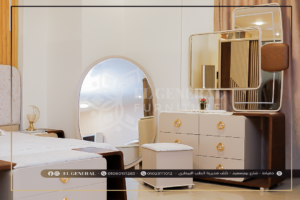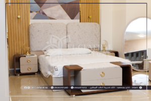 غرفه نوم باللون اوف وايت مع لمسات من القشره الطبيعيه دولاب ضرفتين واحده زجاجيه واخرى خشبية مع سرير فائق الجوده وبقماش منسجم مع لون الغرفة ومعالج لسهولة التنظيف وتسريحه مختلفة بواحدات تخزينيه عمليه وبرواز معلق