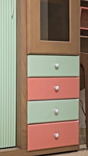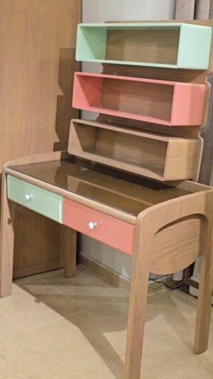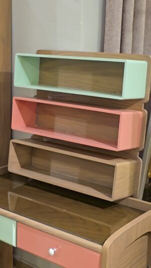 غرف شبابي بألوان مبهرة ومبهجه الدولاب بديزاين ضرفتين جرار وضرفه مفصلات مع وحدات تخزينيه واسعه ومتعدده مع سرير بتنجيد ولا اروع وكمود مميز مع تسريحه تحتوي على تقسيمه مكتبيه بالإضافه الى قطعة إضافيه يمكن إستعمالها كأرفف زينه أ ومرايا طوليه أيضآ