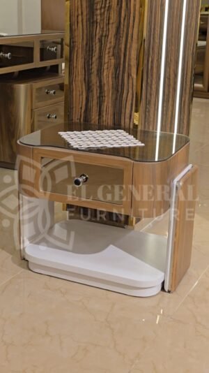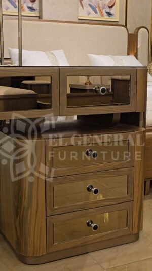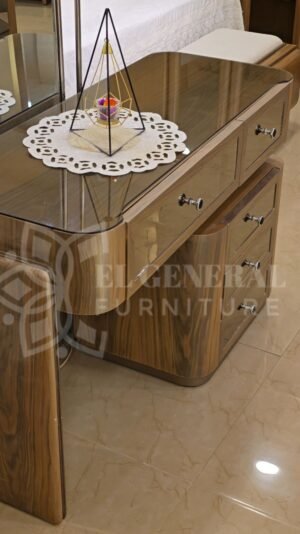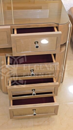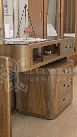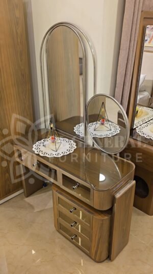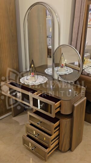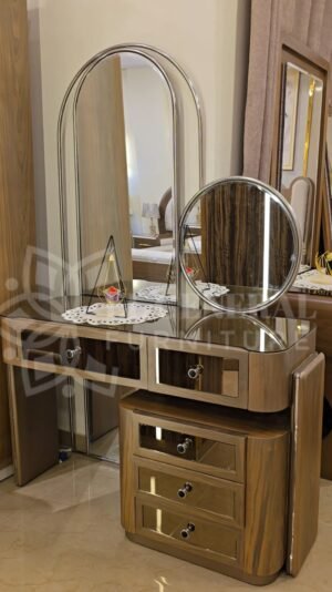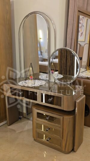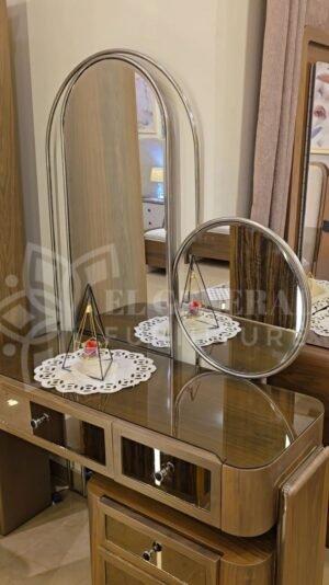 غرفه شبابي شيك جدا تتكون من اربع ضرف 2 خشبيه مغطاة من القشره الطبيعيه و2 ألمونتال بازاز فاميه مع كمود رقيق وعملي وبالاضافه الى تسريحه باتنين برواز من الإستانلس الفضي مع وحدات أدراج متنوعه وعمليه